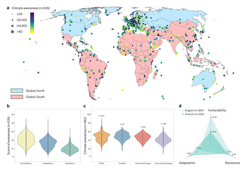 Addressing this gap, the research team conducted a systematic analysis of 535 World Heritage properties by integrating text-mining techniques with large language models (LLMs). The study uncovers pronounced regional differences and persistent mismatches between climate awareness (vulnerability, adaptability, and resilience) and local action (policy process, planning, and management). The results reveal a marked imbalance in the expression of climate awareness within heritage documents: discussions of vulnerability dominate, whereas adaptation and resilience receive far less attention. Although local-level planning and management actions are relatively frequent, they are negatively associated with vulnerability recognition, while policy-level actions exhibit a positive correlation with overall climate awareness. Furthermore, substantial disparities across regions and linguistic systems highlight the need for enhanced cross-regional collaboration and cross-language knowledge sharing.