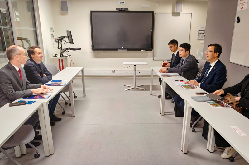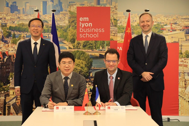 On the morning of Dec 12, Chen held discussions with Nicolas Péjout, executive vice-president, and Mark Smith, vice-president of Emlyon Business School's Paris Campus. They signed a memorandum of understanding on academic cooperation, reaching a high consensus on deepening strategic cooperation between the two schools in fields such as artificial intelligence (AI) and expanding cross-disciplinary integration of advantageous disciplines.