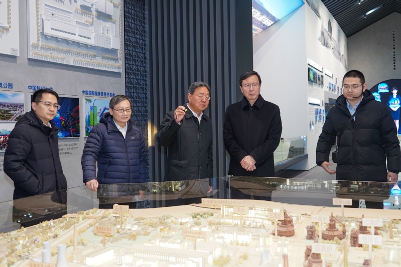 Chen Jie and Han Jiecai conduct research visits to the Shijingshan Planning Exhibition Hall. [Photo/hit.edu.cn]