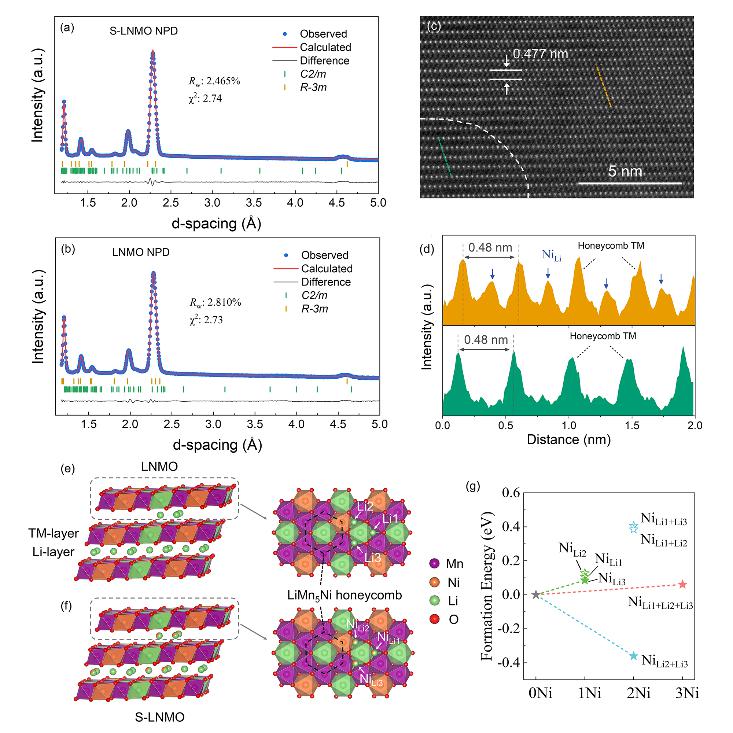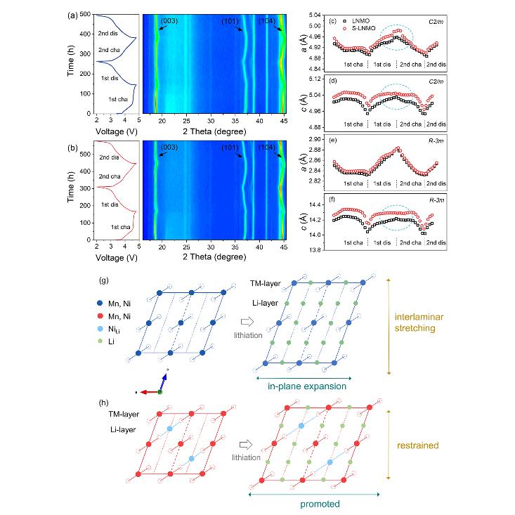 To address these issues, the team designed a unique "cable-stayed honeycomb superstructure" in the lithium-rich cathode material Li1.2Ni0.2Mn0.6O2. This innovative superstructure plays a pivotal role in suppressing capacity degradation and irreversible oxygen release. During charging process, the superstructure promotes in-plane expansion of unit cell along the a-axis while inhibiting interlayer stretching along the c-axis, significantly enhancing the cycling stability of the layered material. Electrochemical tests revealed that the modified material achieves 86% capacity retention after 500 cycles at 1 C, a 34% improvement compared to unmodified samples.