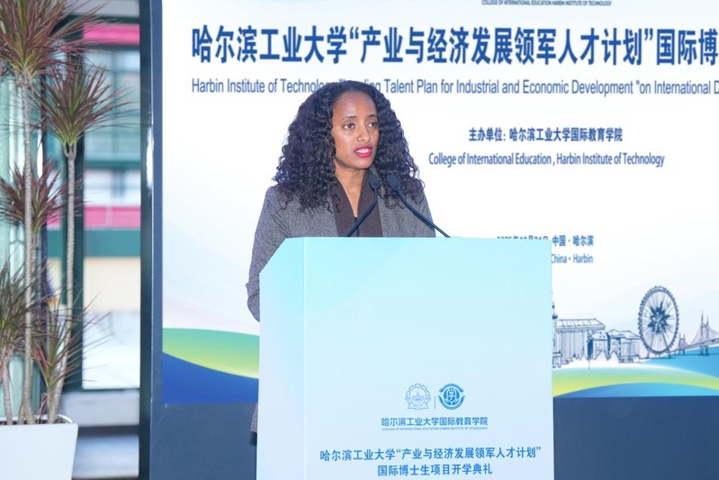 Doctoral student representative, Hana Teferku Benti, director of the Ethiopian Capital Market Authority, delivers a speech.[Photo/hit.edu.cn]