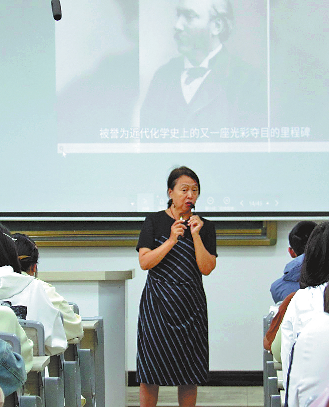 Ju Chunhua gives a lesson about the history of the development of chemistry at Kashi University in Kashgar city, Xinjiang Uygur autonomous region.[Photo/hit.edu.cn]