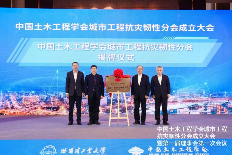 Yi Jun, Li Jiqin, Du Xiuli, and Fan Feng jointly unveil the plaque for the Urban Engineering Catastrophe Resilience Subcommittee of the China Civil Engineering Society. [Photo/hit.edu.cn]