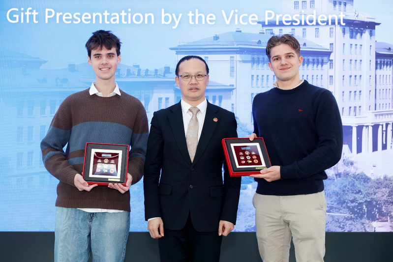 HIT Vice-President Shuai Yong presents university emblems to student representatives from the universities of Cambridge and Oxford. [Photo/hit.edu.cn]