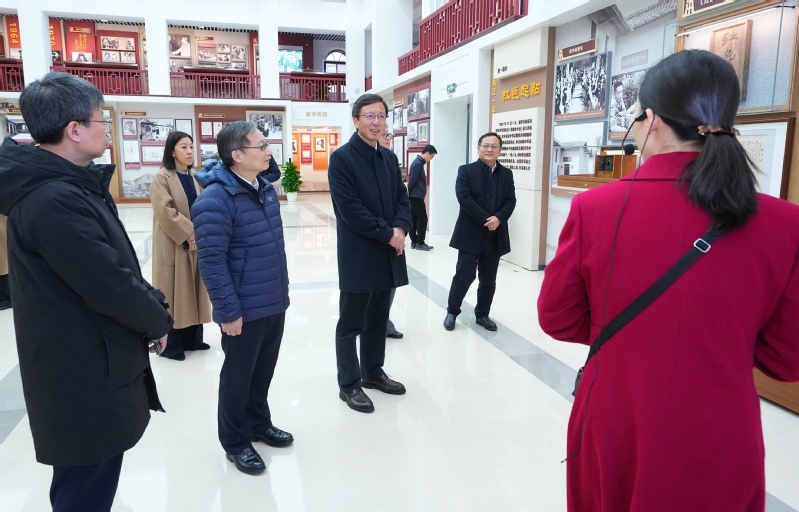 The delegation visits Xinhua's Agency History Museum. [Photo/hit.edu.cn]